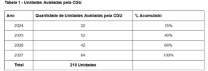 Dos 210 entes autoavaliados, a CGU fará uma análise mais detalhada da documentação apresentada por 32 Unidades em 2024; 52 em 2025; 42 em 2026; e 84 em 2027 (Tabela 1). Essa verificação mais minuciosa permitirá à CGU assessorar as Unidades Setoriais de Integridade, visando melhorar os programas de integridade.
